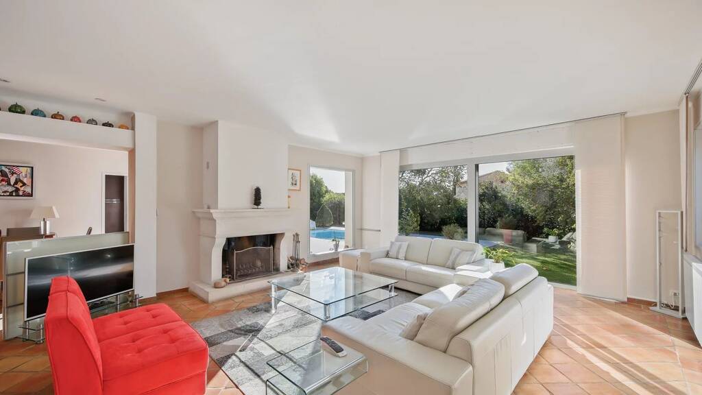 The property features a 60 m2 living room opening directly onto the garden, creating a bright and fluid indoor-outdoor living space.