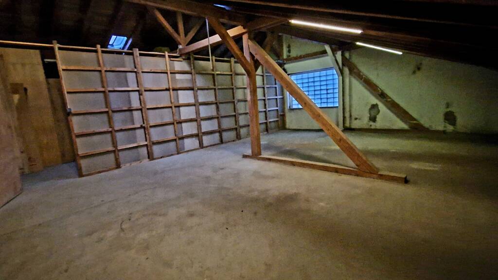 Der Lagerraum liegt im Dachgeschoss der Halle und hat Tageslicht über ein Glasbausteinfenster.