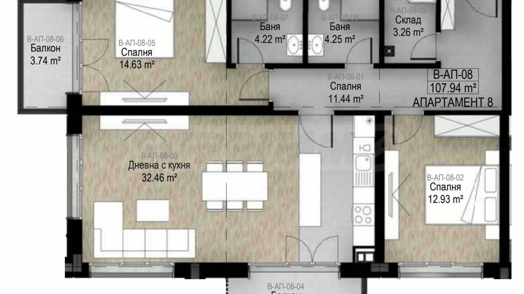 Wohnzimmer/Küche - 32,46 m² mit Terrasse - 4,55 m² Es wird im fertiggestellten Zustand gemäß bulgarischen Baunormen (mit Kitt und Estrich) verkauft.