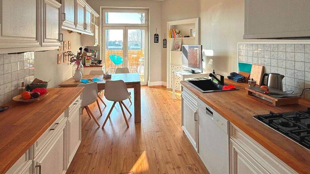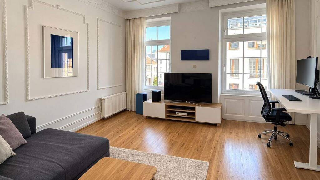 Die Wohnung befindet sich im 4. Obergeschoss eines repräsentativen Altbaus und verfügt über eine Wohnfläche von rund 108 m². Bereits beim Betreten wird der besondere Charakter dieser Immobilie spürbar: Altbautypisch hohe Decken, aufwendig gearbeitete Stuckelemente sowie klassische Sprossenfenster verleihen den Räumen eine elegante und zeitlose Atmosphäre.