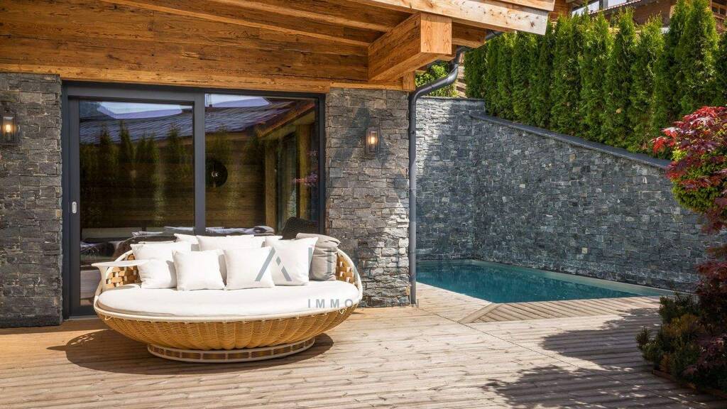 Die Verwendung von edelsten Naturmaterialien wie gehacktes Altholz, Naturstein, feinste Fliesen und Glas verleihen dem Chalet seinen sehr ansprechenden, zeitgemäßen und luxuriösen Chalet-Charakter.