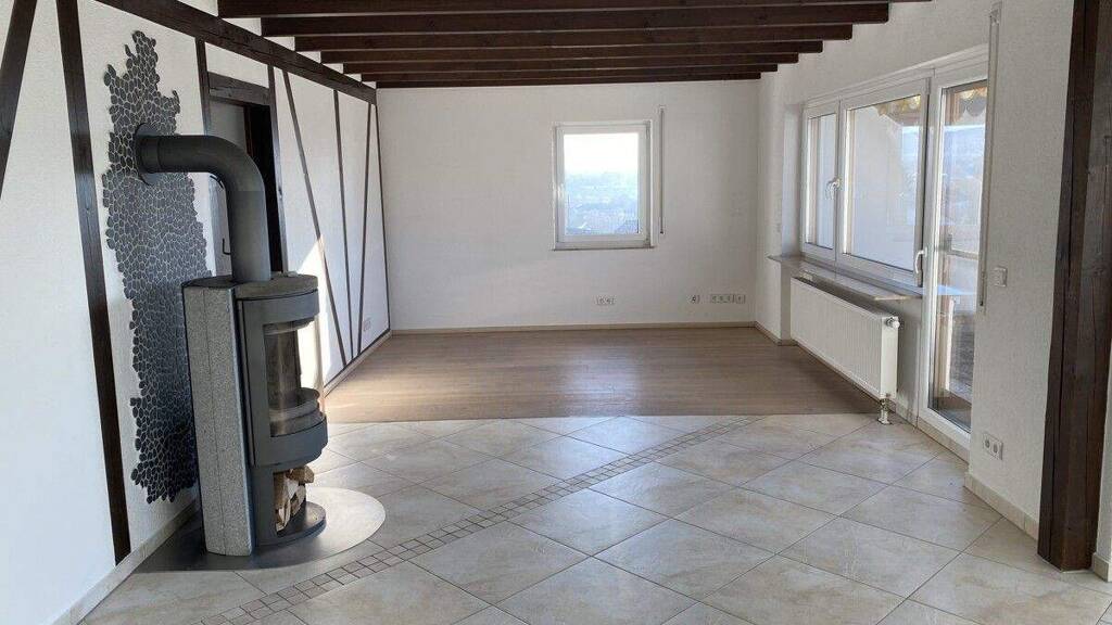 Diese hochwertige Vier-Zimmer-Dachgeschosswohnung befindet sich in einer äußerst gefragten Wohnlage von Aalen-Unterrombach und liegt in einem gepflegten Mehrfamilienhaus mit nur sieben Wohneinheiten. Die ruhige Umgebung, kombiniert mit der erhöhten Lage, sorgt für ein hohes Maß an Privatsphäre und Wohnqualität. Die Wohnung wurde 1982 errichtet und ab dem Jahr 2015 komplett modernisiert. Auf rund 87 m² Wohnfläche überzeugt sie durch eine durchdachte Raumaufteilung, helle Räume und ein stimmiges Wohnkonzept. Besonders hervorzuheben ist der großzügige Wohnbereich mit hochwertigem Echtholzparkett und Kamin, der eine angenehme, wohnliche Atmosphäre schafft. Ein echtes Highlight ist die südlich ausgerichtete Loggia. Sie bietet einen hervorragenden, weiten Ausblick und lädt zu entspannten Stunden im Freien ein. Durch die Dachgeschosslage genießen Sie hier einen besonders hohen Erholungsfaktor und viel Ruhe. Die separate Küche ist funktional gestaltet und mit einer hochwertigen, neuen Einbauküche ausgestattet. Das modernisierte Tageslichtbad verfügt über eine Dusche und eine Badewanne. Ein separates WC ergänzt den Wohnkomfort. In Bad und Küche sorgt eine Fußbodenheizung für angenehme Wärme, während die Wohnung insgesamt über eine Gas-Etagenheizung beheizt wird. Die neuen Kunststofffenster sowie elektrische Rollläden tragen zu einem angenehmen Raumklima bei. Großzügiger Nutzraum steht im ebenfalls komplett renovierten und gedämmten Dachboden zur Verfügung. Ebenfalls gehört ein separater Kellerraum zur Wohnung der zusätzlichen Stauraum bietet. Außerdem gibt es gemeinschaftliche Hauswirtschafts- und Technikräume. Abgerundet wird dieses attraktive Angebot durch eine zur Wohnung gehörende Garage mit elektrischem Tor sowie Strom- und Wasseranschluss. Diese Immobilie überzeugt durch ihre Top-Lage, den hervorragenden Ausblick und eine Ausstattung, die komfortables Wohnen auf hohem Niveau ermöglicht.