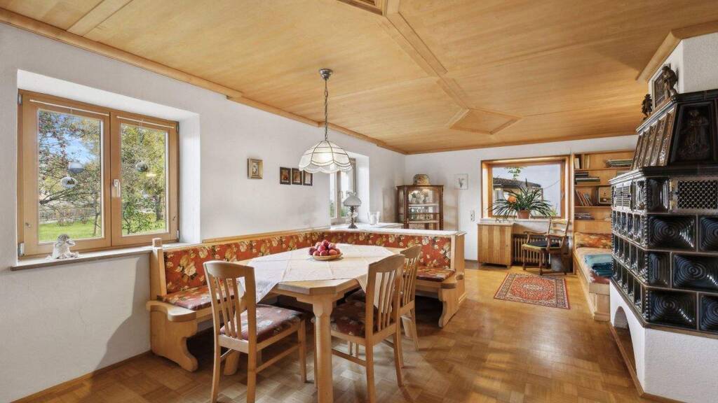 Der großzügige Wohnbereich besticht durch eine gemütliche Atmosphäre, die unter anderem durch den stilvollen Kachelofen unterstrichen wird - perfekt für behagliche Abende in der kühleren Jahreszeit. Die angrenzende Südterrasse lädt zum Entspannen und Verweilen im Freien ein, während der große Balkon im Obergeschoss einen schönen Blick ins Grüne bietet.