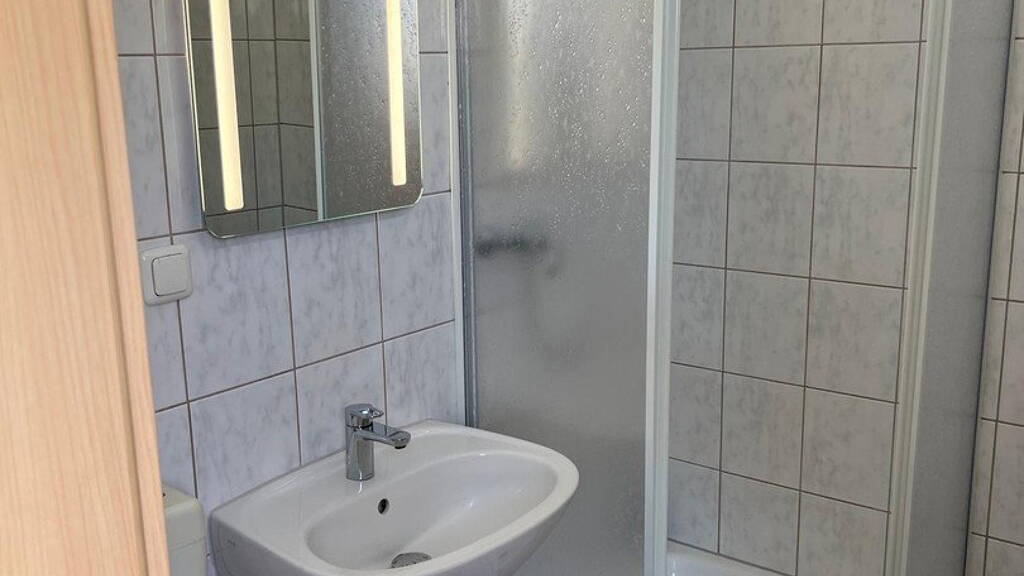 Duschbad, Fliesen im gesamten Wohnbereich, Singleküche. Waschküche mit Waschmaschine und Trockner im Münzbetrieb.