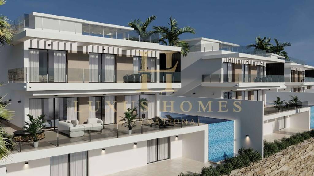 LUXUS HOMES präsentiert Ihnen stolz dieses neue Projekt von 5 Villen im zeitgenössischen Stil in Finestrat (Alicante) in einer der exklusivsten Gegenden an der Costa Blanca, die den besten Blick auf die Urbanisation und die Gegend bietet. In den Häusern werden die besten Materialien und exklusive Designbeschichtungen verwendet. Das Gefühl im Inneren ist dank der Fenster mit Blick auf das Meer und der hohen Decken sehr geräumig, mit zwei Räumen mit doppelter Höhe im Flur und im Wohn-Esszimmer. Die bebaute Fläche aller Villen beträgt mehr als 400 m² und die Fläche der Grundstücke variiert zwischen 550 und 950 m2. Die Villen verfügen über 4 Schlafzimmer, 5 Badezimmer, ein Wohn-Esszimmer-Küche, eine Waschküche, eine Garage für mehrere Autos und Mehrzweckräume, die sich alle auf 2 erste Etagen und 1 Souterrain verteilen. Im Außenbereich gibt es einen Swimmingpool mit Meerblick, große Terrassen auf allen Etagen und einen großen Gartenbereich mit Blick im Souterrain. Die Energieeffizienz des Hauses ist sehr hoch. Die Fassade besteht aus Ytong-Blöcken. Die Tischlerei und das Glas haben eine geringe Wärmeleitfähigkeit. Die Kanalklimaanlage verfügt über eine Wärmepumpe und es gibt auch eine Fußbodenheizung im ganzen Haus, eine Lüftungsanlage mit Lufterneuerung und ein Wärmerückgewinnungssystem. Das gesamte Haus verfügt über LED-Beleuchtung, sowohl innen als auch außen.