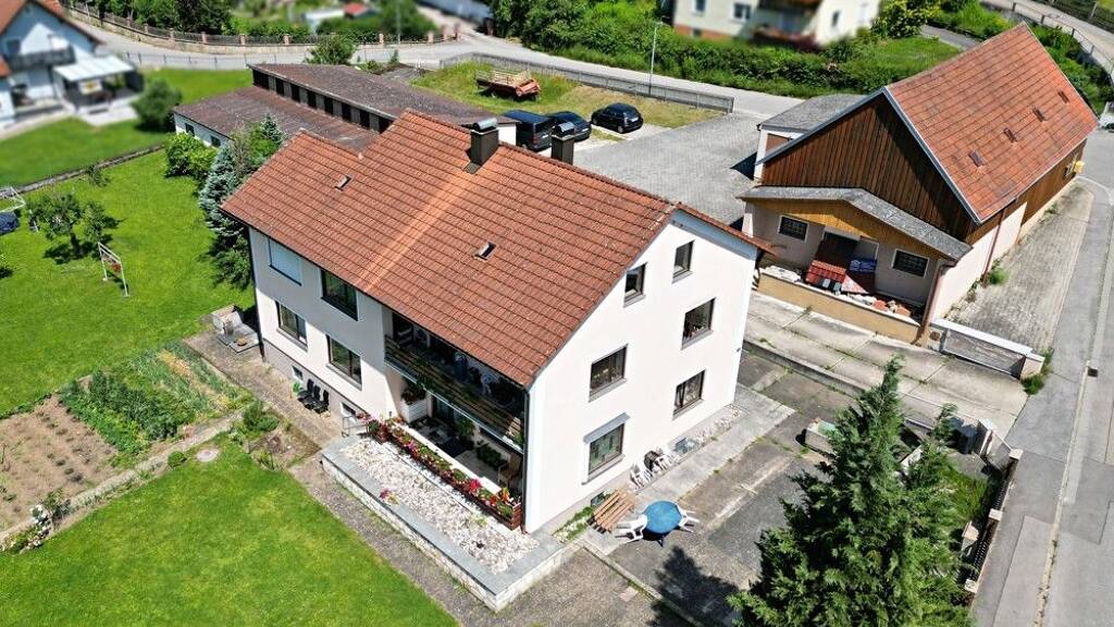 Auf dem Anwesen des ehemaligen Baustoffhandelsunternehmens wurde um das Jahr 1970 ein Mehrgenerationenhaus in Massivbauweise erbaut und bietet ausreichend Platz für zwei Familien.