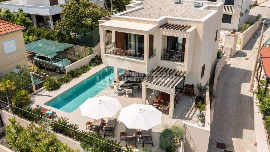 Wir vermitteln den Verkauf einer Luxusvilla in einer malerischen Bucht auf der Insel Ciovo, in zweiter Reihe zum Meer. Die Villa befindet sich auf einem Grundstück von 501 m2, während die Bruttofläche der Villa 290 m2 beträgt. Die Villa ist auf drei Etagen verteilt. Im Erdgeschoss gibt es ein geräumiges Wohnzimmer, ein Esszimmer und eine moderne Küche. Die Innentreppe führt in den ersten Stock, wo sich drei Schlafzimmer mit eigenem Bad und Ausgang zu den Balkonen befinden, von denen aus man einen bezaubernden Blick auf das offene Meer hat. Im Tiefparterre befinden sich eine geräumige Garage, ein Wohnbereich, ein Maschinenraum sowie ein Schlafzimmer mit Bad und einer kleinen Loggia. Vor der Villa befindet sich ein beheizter Swimmingpool mit Liegewiese, umgeben von einem wunderschönen Garten. Vor der Villa gibt es auch ein überdachtes Esszimmer im Freien. Die Villa wird komplett möbliert verkauft. Wenn der zukünftige Eigentümer eine Dachterrasse hinzufügen möchte, sind die Wasser-, Strom- und Abwasserinstallationen bereits vorbereitet. Das Anwesen ist mit einer Alarmanlage und Kameras sowie einem automatischen Gartenbewässerungssystem ausgestattet. Die Villa verfügt über eine Garage und einen Außenstellplatz. Die Insel Ciovo ist dank der neu gebauten Brücke gut mit dem Festland verbunden und auch der Flughafen Split, die Stadt Trogir und Split liegen in der Nähe. Diese moderne Neubauvilla eignet sich für einen ganzjährigen Aufenthalt. Sie ist ideal für alle, die am Meer wohnen und die zauberhafte Natur und eine der attraktivsten Küstenregionen Kroatiens kompromisslos genießen möchten, hat aber auch großes Potenzial als Villa zur touristischen Vermietung.