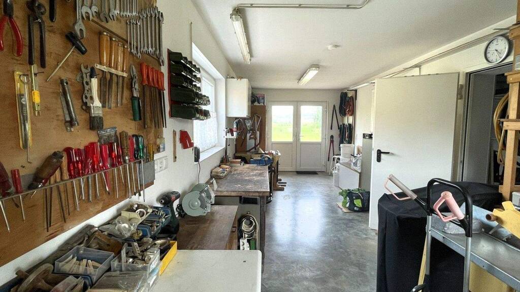 Vom Hauseingangsbereich aus gelangt man direkt in die große Doppelgarage, und zu den beiden beheizten Werkstatt- oder Lagerräumen mit zusätzlichem Bad. Diese Räume sind auch von außen zugänglich und bieten vielfältige Nutzungsmöglichkeiten - ideal für Handwerk, Hobby oder bei Bedarf auch für gewerbliche Zwecke.