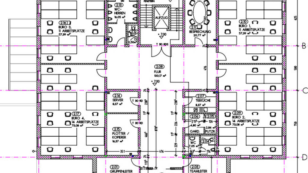 Das 1. OG und 2. OG sind in jeweils 7 Büros, 1 Besprechungsraum, eine Teeküche und Garderobe, 1 Serverraum, 1 Kopierraum und getrennte Damen und Herren-WCs unterteilt.