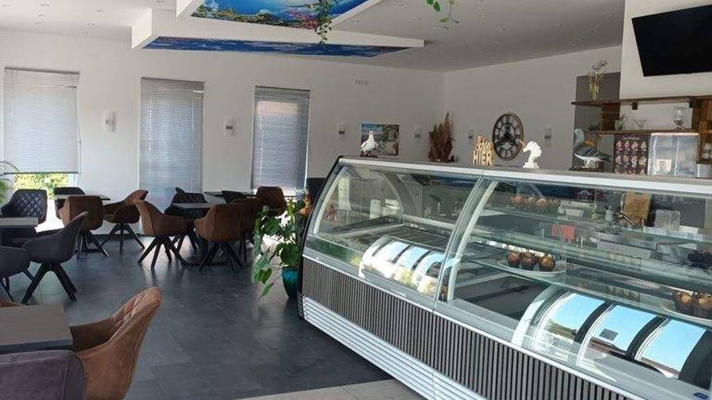 Es befinden sich im vorderen und hinteren Bereich jeweils ein Gastraum, ein heller Thekenbereich, eine Gastroküche, zwei Gäste-WCs und eine Außenterrasse.