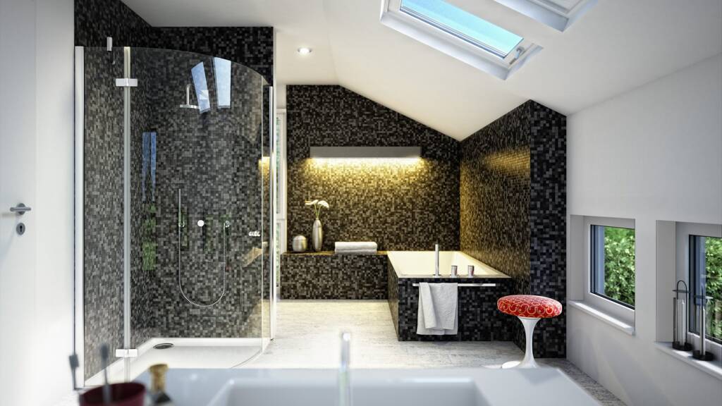 Das Zuhause-Paket beinhaltet hochwertige Innenausbaumaterialien, bodengleiche Duschen mit Echtglasabtrennung und Fliesen im gesamten Erdgeschoss. Aluminiumgeschäumte Rollläden verbessern den Hitzeschutz im Sommer und die Wärmedämmung im Winter.