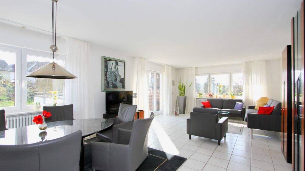 Der großzügige, lichtdurchflutete Wohnbereich bildet das Herzstück des Hauses. Von hier aus gelangen Sie auf die beeindruckende, auf drei Garagen errichtete Terrasse - ein echtes Highlight der Immobilie. Elektrische Markisen sorgen für angenehmen Schatten und zusätzlichen Komfort. Über eine elegante Wendeltreppe erreichen Sie direkt den schönen weitläufigen Garten und genießen eine perfekte Verbindung von Innen- und Außenbereich.