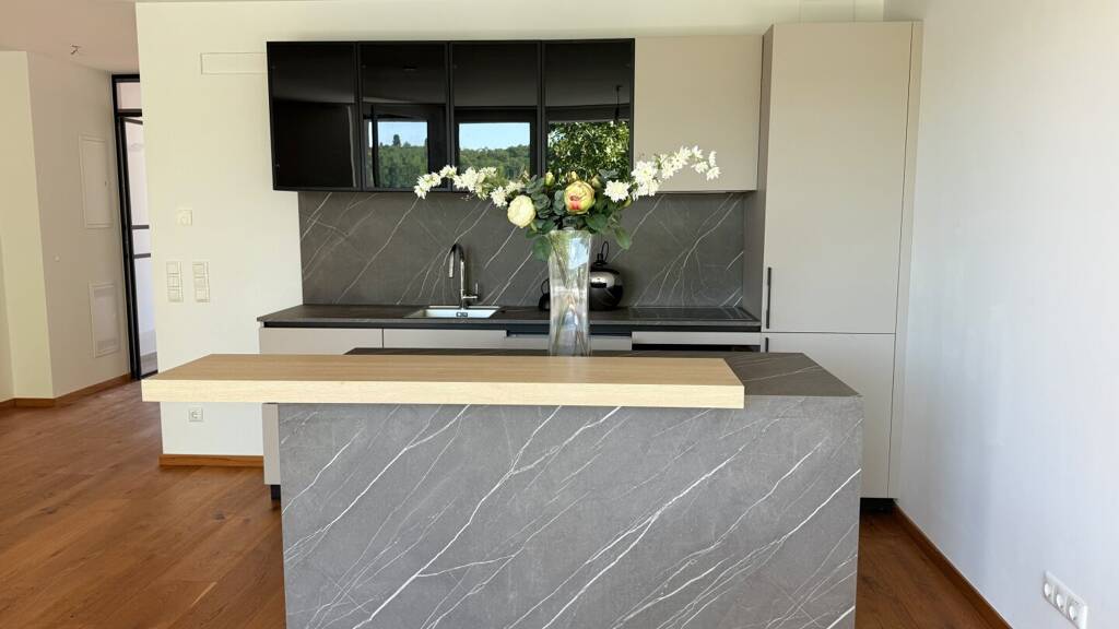 Der großzügige Wohnbereich beeindruckt mit raumhohen Fenstern, die eine angenehme Helligkeit schaffen und den Blick in die Natur freigeben. Eine hochwertige italienische Designer-Einbauküche sorgt für kulinarische Genussmomente und fügt sich harmonisch in den Wohnbereich ein.