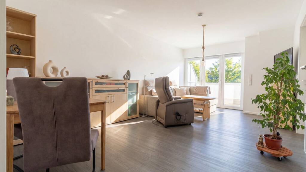 Die Wohnung überzeugt durch eine durchdachte Raumaufteilung und eine helle, freundliche Atmosphäre. Der großzügige Wohn- und Essbereich bildet den Mittelpunkt der Einheit und wird durch den nach Süden ausgerichteten Balkon ideal ergänzt. Dieser erweitert den Wohnraum nach außen und sorgt dank seiner Ausrichtung für eine angenehme natürliche Belichtung über den gesamten Tagesverlauf.