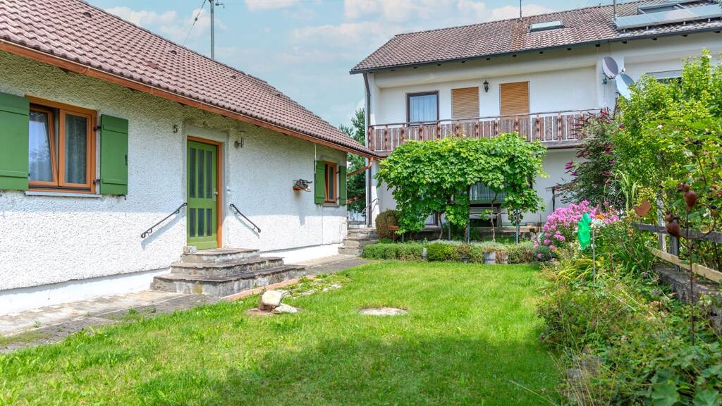 Diese exklusiv von Gerle & Piehler Immobilien angebotene Immobilie hat ein Alleinstellungsmerkmal. Sie bietet zwei Wohneinheiten in Form einer Doppelhaushälfte und einem freistehenden Bungalow - beide direkt auf einem gemeinsamen Grundstück. Ein gemeinsamer, großzügiger Garten lädt zu Entspannung und Freizeitaktivitäten ein, und die angrenzende Terrasse sorgt für idyllische Außenmomente direkt vor der Tür.
