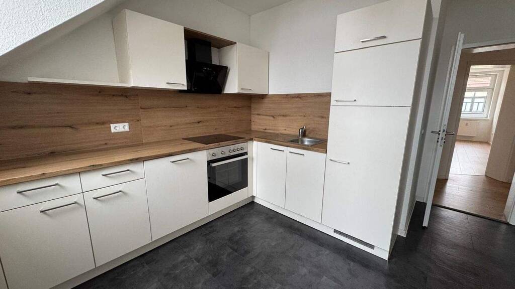 . sanierte 3-Raum-Wohnung im Dachgeschoss . moderne Einbauküche (Made in Germany) . innenliegendes Bad mit Regendusche . hochwertiges Laminat in den Wohnräumen . frisch renovierte Wand- und Deckenflächen