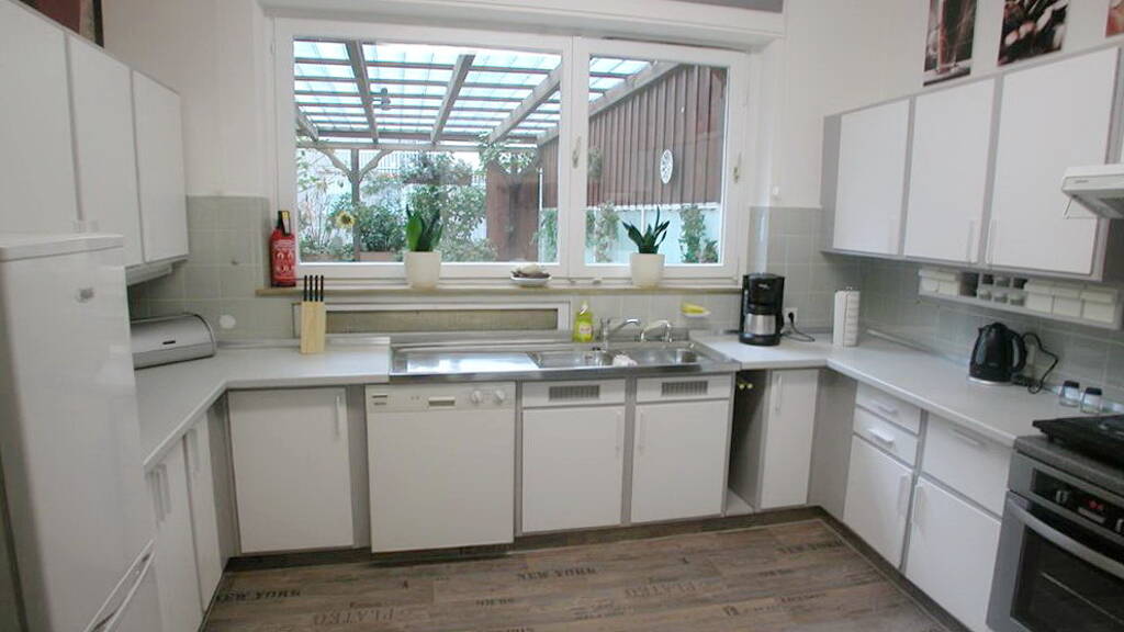 Die Küche ist mit Spülmaschine, Kühl-/Gefrierschrank, Backofen, mehrere Elektroherde, Mikrowellen, Kaffeemaschinen, Wasserkocher, Toster etc. sowie Geschirr, Besteck und Kochgeräten ausgestattet.