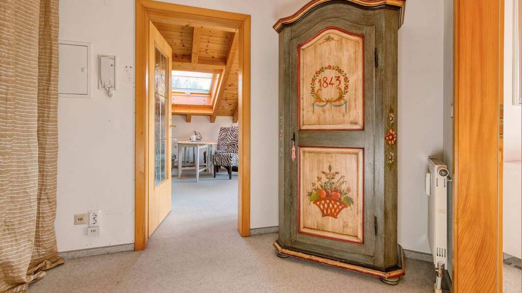 Der Grundriss der Dachgeschosswohnung wurde konsequent auf Funktionalität und Wohnqualität ausgelegt. Eine großzügig dimensionierte Diele bildet den Empfangsbereich der Wohnung. Sie bietet ausreichend Platz für eine durchdachte Stauraumorganisation – ob Garderobe, Schranksystem oder Abstellfläche für Bergausrüstung und Skimaterial.