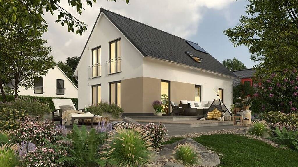 Das großzügige Haus mit dem schönen Satteldach überzeugt mit viel Platz und einem variablen Grundriss. Das Wohnzimmer schenkt genügend Raum zur Erholung, die sich anfügende Essecke wird schnell zum gemütlichen Familienmittelpunkt mit direktem Zugang zur Küche. Die hohen Fenster fangen das Tageslicht besonders gut ein. Jeder Raum im Haus wirkt offen und freundlich. Ein Arbeits- oder Kinderzimmer und das Gäste-WC runden das Erdgeschoss perfekt ab.