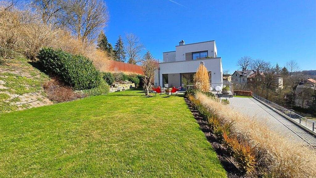 Diese außergewöhnliche Villa im Bauhausstil aus dem Jahr 2015 vereint moderne Technik mit stilvollem Design und höchstem Wohnkomfort. Auf ca. 224 m² Wohnfläche, zzgl. Nutzfläche und einem großzügigen Grundstück von ca. 1.214 m² bietet diese ein exklusives Zuhause für höchste Ansprüche. Die Außenwände wurden mit dem Klimapor-Wandsystem errichtet, wodurch zu jeder Jahreszeit ein angenehmes Raumklima gewährleistet ist. Im Erdgeschoss erwartet Sie ein großzügiger, atelierartiger Eingangsbereich mit Occhio-Leuchten und durchdachten Einbaulösungen. Ergänzt wird diese Ebene durch einen Hauswirtschaftsraum mit Gartenzugang sowie zwei praktische Abstellräume. Die barrierefreie Raumplanung wird durch einen Aufzug ergänzt, der alle Etagen erschließt. Zusätzlich verbindet ein offen gestalteter Treppenaufgang mit wärmeschutzverglastem Lichtband die Ebenen. Das Herzstück des Hauses befindet sich im ersten Obergeschoss: Ein lichtdurchfluteter Wohnbereich mit Kamin, eine exklusive Markenküche mit weißen Hochglanzfronten, Kochinsel, hochwertigen Miele-Geräten sowie einem Frühstückstresen aus amerikanischem Nussbaum schaffen ein stilvolles Ambiente. Der Essbereich mit Platz für bis zu acht Personen bietet Zugang zur Terrasse und einen herrlichen Ausblick durch das große Panoramafenster. Ein separater Vorratsraum mit Einbauschränken sorgt für zusätzlichen Stauraum. Ebenso auf dieser Etage: ein Panorama-Schlafzimmer mit Blick in die Natur, eine großzügige Ankleide mit Tageslicht und maßgefertigten Einbauschränken sowie ein hochwertig ausgestattetes Bad mit ebenerdiger Dusche. Im zweiten Obergeschoss lädt der Wellnessbereich mit großer Panoramasauna, luxuriösem Bad, Ruheraum mit Kamin und Einbaubücherschrank zur Entspannung ein. Eine weitere Terrasse eröffnet einen einzigartigen Blick über das Schwarzatal, die Dächer der Stadt und die umliegenden Wälder. Gästezimmer und Gästetoilette runden das Raumangebot ab. Bei der Planung des Hauses wurde besonders auf eine barrierefreie und altersgerechte Ausstattung geachtet. Dieses Haus verbindet Eleganz mit durchdachter Funktionalität und bietet dank seiner komfortablen Ausstattung höchsten Wohnkomfort - heute wie auch in Zukunft. Das Grundstücks- und Garagentor lassen sich per Fernbedienung öffnen, während der schwellenfreie Zugang vom Eingangsbereich und der Garage in alle Wohnbereiche mühelos gelingt. Ein moderner Aufzug, der beide Wohnebenen verbindet und mit einem Notruf-Telefon ausgestattet ist, garantiert zusätzliche Sicherheit. Breite Türen und großzügige Bewegungsflächen verleihen dem gesamten Haus ein offenes, repräsentatives Raumgefühl. Der Wohn- und Schlafbereich ist geschickt auf einer Ebene konzipiert, wodurch kurze Wege und uneingeschränkte Bewegungsfreiheit gewährleistet sind. Extragroße, ebenerdige Duschkabinen unterstreichen den luxuriösen und barrierefreien Anspruch der Badezimmer. Für zeitgemäßen Komfort sorgt zudem eine stabile WLAN-Abdeckung in allen Räumen, sodass Arbeiten, Wohnen und Entspannen perfekt miteinander harmonieren. Zur hochwertigen Ausstattung zählen darüber hinaus Außentüren mit Fingerscan-Öffnung, eine Alarmanlage mit Videoüberwachung, automatisierte Außenjalousien, Holzfenster mit Aluverkleidung, edle Schiefer- und Eichenholzböden sowie Muschelkalk am Haussockel. Die Doppelgarage bietet Platz für zwei Fahrzeuge. Der modern gestaltete Garten überzeugt mit Cortenstahl-Elementen, automatischer Bewässerung über Zisterne und Tiefbrunnen sowie einem Mähroboter. Bei der Planung wurde großer Wert auf stilistische Klarheit, langlebige Materialien, durchdachte Lichtführung und intelligente Stauraumlösungen gelegt.