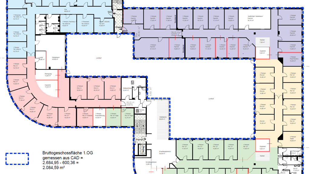 Das EG verfügt über 2.082 m², das 1. OG über 1.818 m² wovon ab 11/23 noch 982,53 m² langfristig vermietet sind und 836 m² zur Nutzung frei werden.