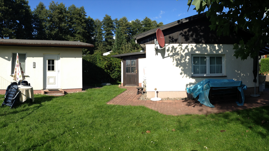 Zum Verkauft steht ein schönes, pflegeleichtes Grundstück in einem kleinen ruhigen Erholungsgebiet, welches 1998 mit einem Bungalow und einem weiteren kleinen Gebäude bebaut wurde. Das größere Gebäude