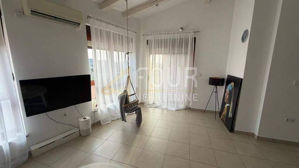 In Liznjan, wird eine schöne, voll möblierte Maisonette-Wohnung im zweiten, auch letzten Stock eines neueren Gebäudes vermietet. Die Wohnung strahlt Leichtigkeit und eine gute Raumaufteilung aus: Beim Betreten befinden sich auf der rechten Seite zwei Schlafzimmer, eines davon mit eigenem Bad, während auf der linken Seite ein zusätzliches Badezimmer liegt. Der zentrale Teil der Wohnung besteht aus einem geräumigen Wohnzimmer, das mit Küche und Esszimmer verbunden ist, von dem aus man auf eine Terrasse mit einem sehr schönen, offenen Blick gelangt.
