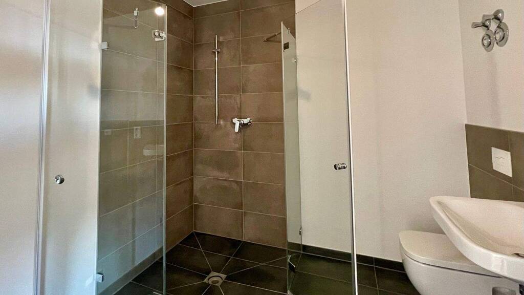 Badezimmer mit WC und bodentiefer Dusche inkl. Glasabtrennung, moderne 30x60 Fliesen