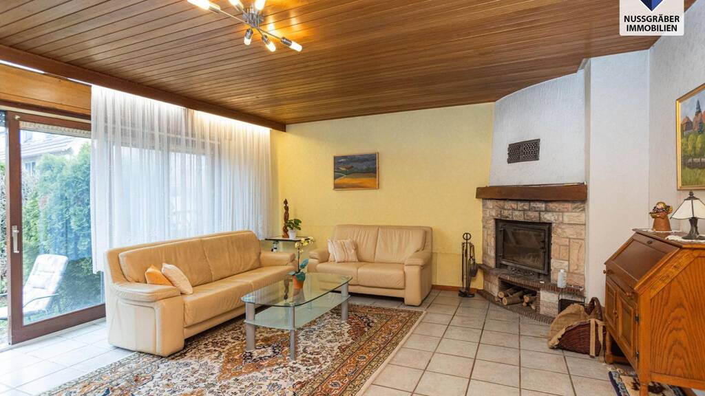 Im Erdgeschoss befindet sich das großzügige Wohnzimmer mit offenem Kamin und direktem Zugang in den Garten. Der angrenzende Essbereich bietet einen weiteren, direkten Gartenzugang zur sonnigen Terrasse.