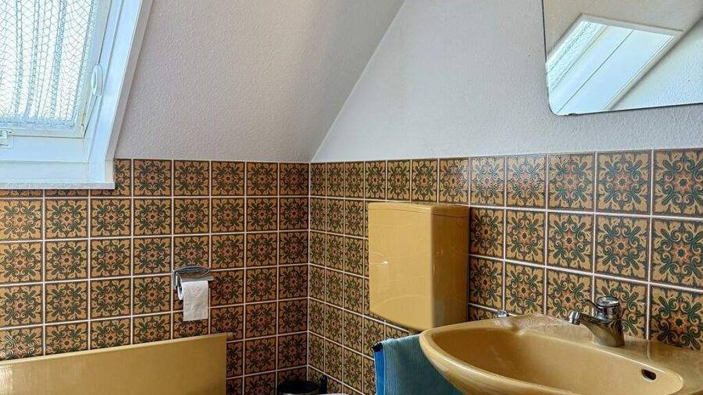 Über das Treppenhaus mit Glasbausteinen - hell durch viel Tageslicht, jedoch energetisch verbesserungswürdig - gelangen Sie ins Obergeschoss. Dort erwarten Sie drei Kinderzimmer, ein Schlafzimmer sowie eine zusätzliche Toilette. Ein Balkon, der sowohl vom Schlafzimmer als auch von einem Kinderzimmer begehbar ist, bietet einen schönen Blick ins Grüne.
