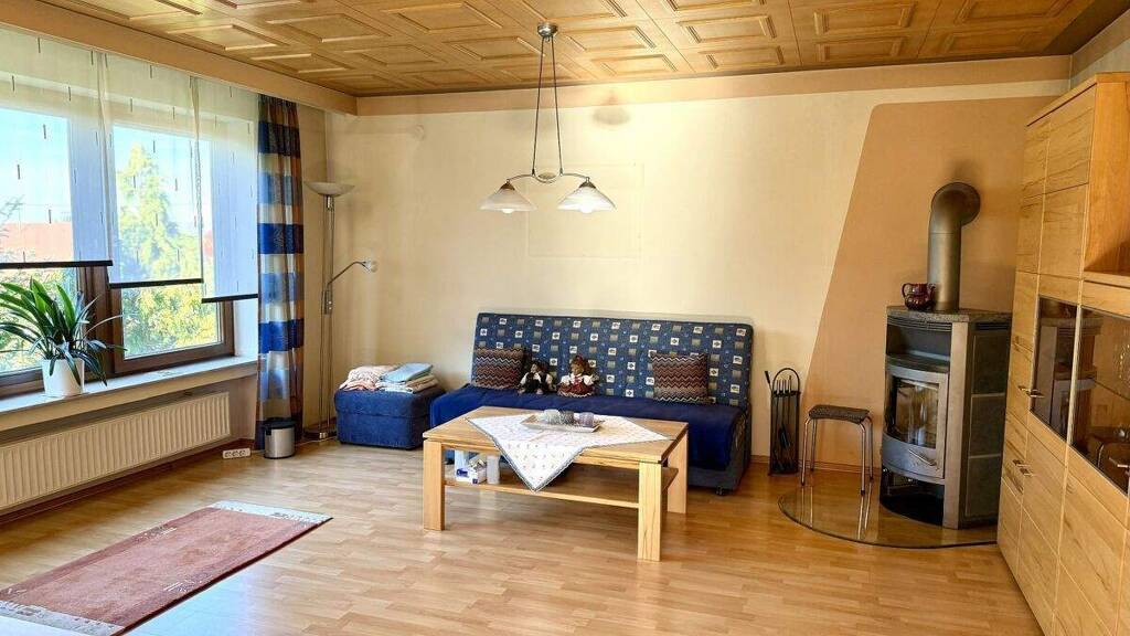 Bereits beim Eintreten fallen der Windfang und das helle Treppenhaus mit ausreichend Platz für Garderobe und Kommode auf. Die Küche, das Esszimmer und das Wohnzimmer sind als separate Räume gestaltet und bieten dadurch hohe Flexibilität im Alltag. Die moderne Einbauküche (ca. 2013) weiß durch die hellgrauen Fronten und die Hochschränke sowie die Arbeitsfläche in Holzoptik zu gefallen. Sowohl vom Esszimmer als auch vom Wohnzimmer aus erreichen Sie die überdachte Terrasse - ideal für entspannte Familienabende oder gesellige Runden im Freien. An kühleren Tagen sorgt der gemütliche Kachelofen im Wohnzimmer für wohlige Wärme.