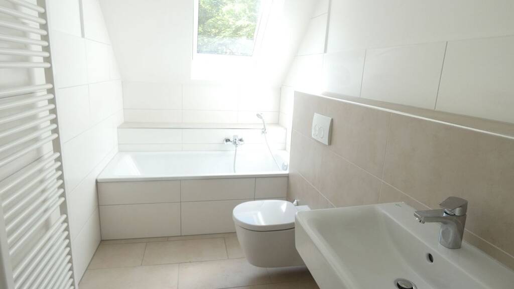 Ausstattung: - Tageslichtbad mit Handtuchheizkörper, Badewanne, Wand-WC mit Vorwandinstallation, Waschmaschinenanschluss und modernem Handwaschbecken - moderne Wand- und Bodenfliesen (Format 30x60cm) im Tageslichtbad - hochwertige Designboden in Holzoptik im gesamten Wohnbereich - Kunststofffenster mit Isolierverglasung - Raufaser weiß tapezierte Wände - mietereigener Kellerraum
