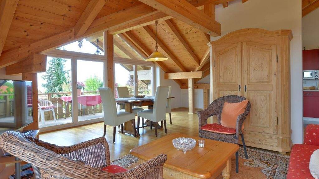 Zwei Balkone mit traumhaftem See- und Bergblick (Ost- & Südbalkon) Helle Räume mit offenem Sichtdachstuhl Gemütliches Schlafzimmer mit viel Holz, Dachschräge und Wohlfühlambiente Offene Küche im Wohn- und Essbereich Modernes Badezimmer mit großer Badewanne, Dusche, Waschbecken und WC Kostenloses Internet Stellplatz direkt vor dem Haus