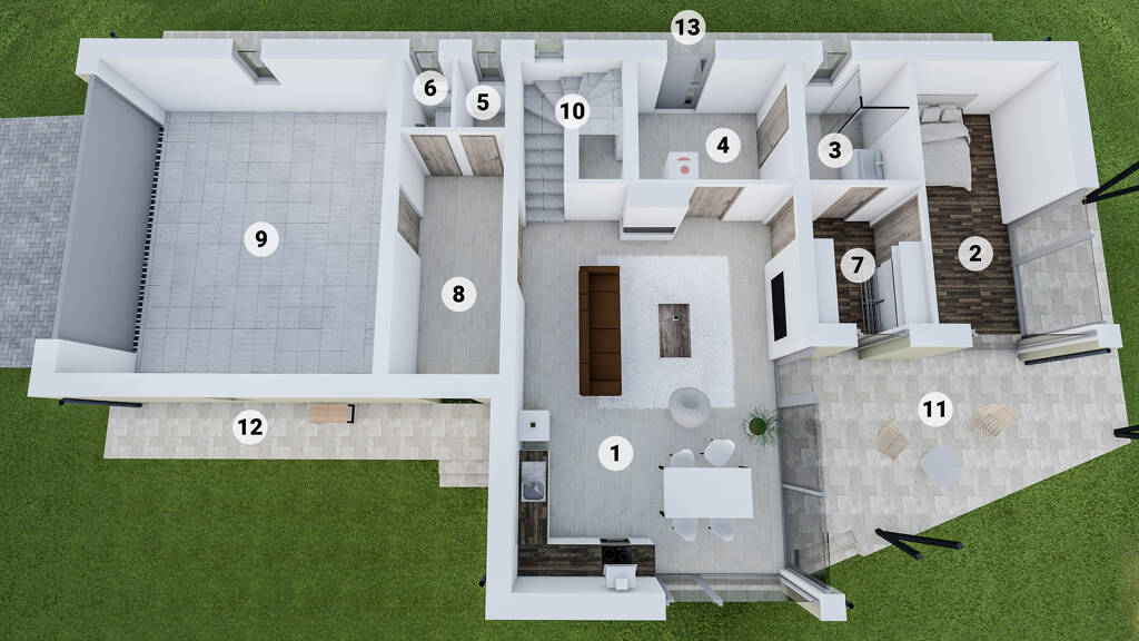 Im Erdgeschoss: große Küche-Wohnzimmer-Esszimmer-Kombination, 1 Zimmer, 2 Ankleidezimmer, Badezimmer + WC, separates WC, Speisekammer, Technik- und Waschraum, Flur, Garage, Terrasse.
