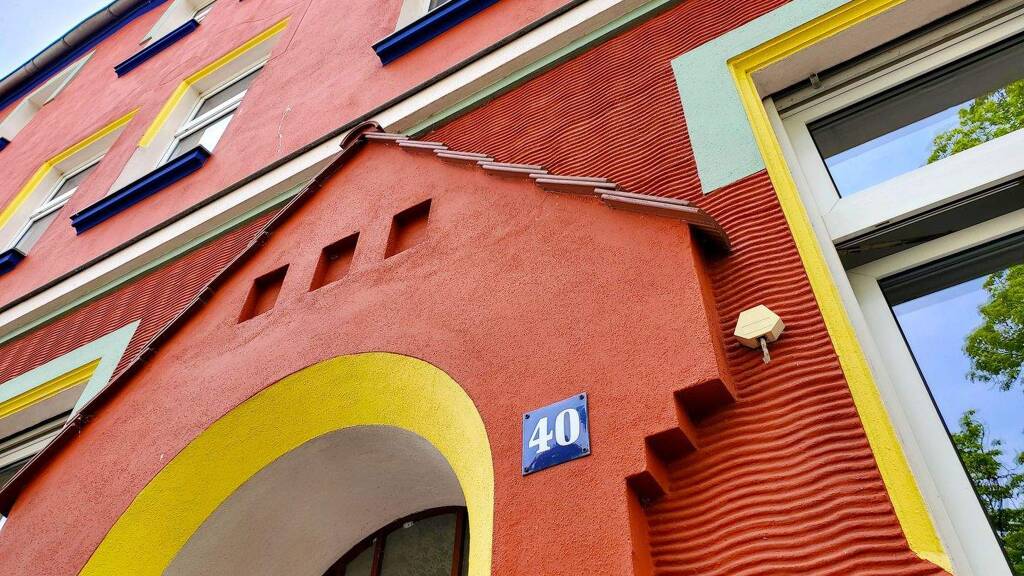 Die bunten Häuser in der Otto-Richter-Straße liegen direkt an einer Kleingartenanlage und ganz in der Nähe befindet sich eine Hundewiese.