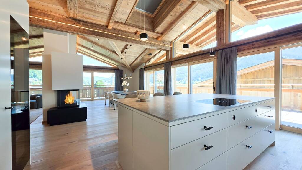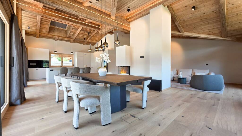 Bereits bei der massiven Altholz Eingangstüre sowie der Altholzinnentüren wird die Qualität der Ausstattung klar. Diverse Schreiner Einbaukästen, ein Loxone System, der offene Kamin, die Occhio Lampen und die Profi-Küche sorgen neben den sorgfältig ausgewählten Oberflächen für maximales Wohlbefinden.