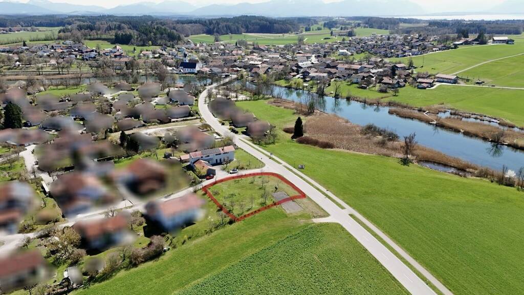 Das Grundstück am Ortsrand bietet auf der einen Seite einen weitläufigen Blick auf Felder und auf der anderen Seite einen herrlichen Blick auf ein Naturschutzgebiet, die Alz und die Chiemgauer Alpen.