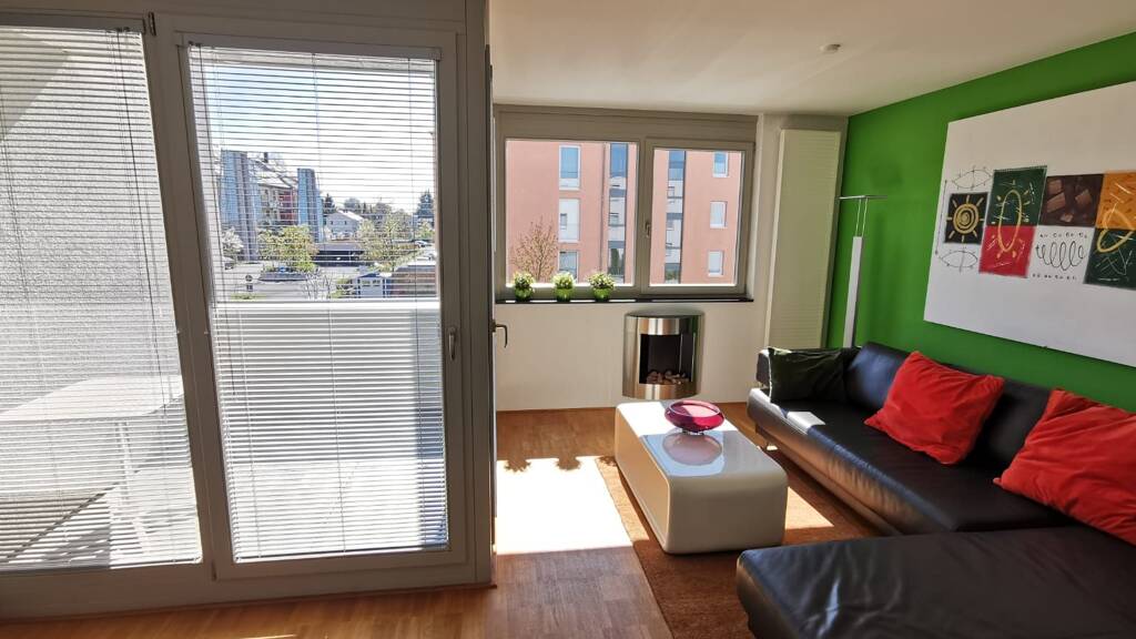 Modern high-gloss fitted kitchen with branded appliances; large fridge-freezer combination, microwave, dishwasher, stainless steel sink, oven, induction hob, extractor hood (circulating air), complete kitchen equipment spacious dining room with large extendable table and six leather swivel chairs, connection to the kitchen with sliding door; living room with large flat-screen TV (DVB-T2 HD) and inviting corner leather couch (electrically extendable for use as guest accommodation for up to 2 persons); maisonette-high loggia with two entrances from the living room; hallway basement with large built-in wardrobe for clothes and separate shoe part; in the living room and bedroom floor-to-ceiling windows with lamella interior blinds; electric exterior roller shutters with remote control; oiled oak parquet in all living rooms and kitchen; interior bathroom with shower-bathtub; the bathroom, the guest toilet and the washroom are tiled; parents' bedroom with double bed and large sliding door wardrobe; children's/study 1 with two single box-spring beds, desk and wardrobe; children's/study 2 with sofa bed, desk and wardrobes; washroom with washing machine and condensation dryer (brand name appliances) as well as large storage shelf; no WLAN, no cellar compartment; shared bicycle storage room and shared laundry room in the basement can be used; an extra wide car parking space in the inner courtyard can be rented for €50/month if required, a car parking space in the underground car park for €75/month; direct access from the underground car park to the stairwell and to the apartment.