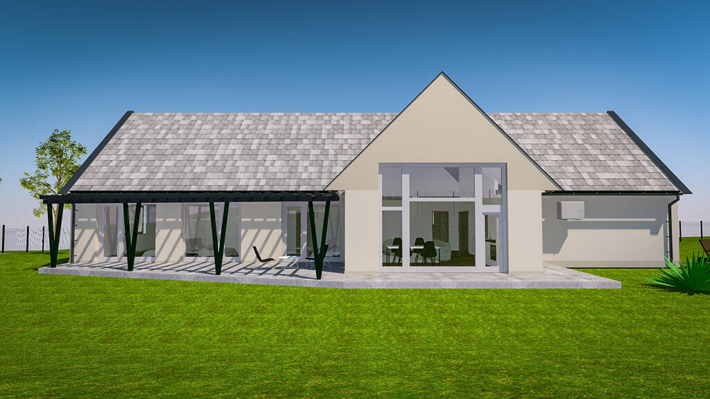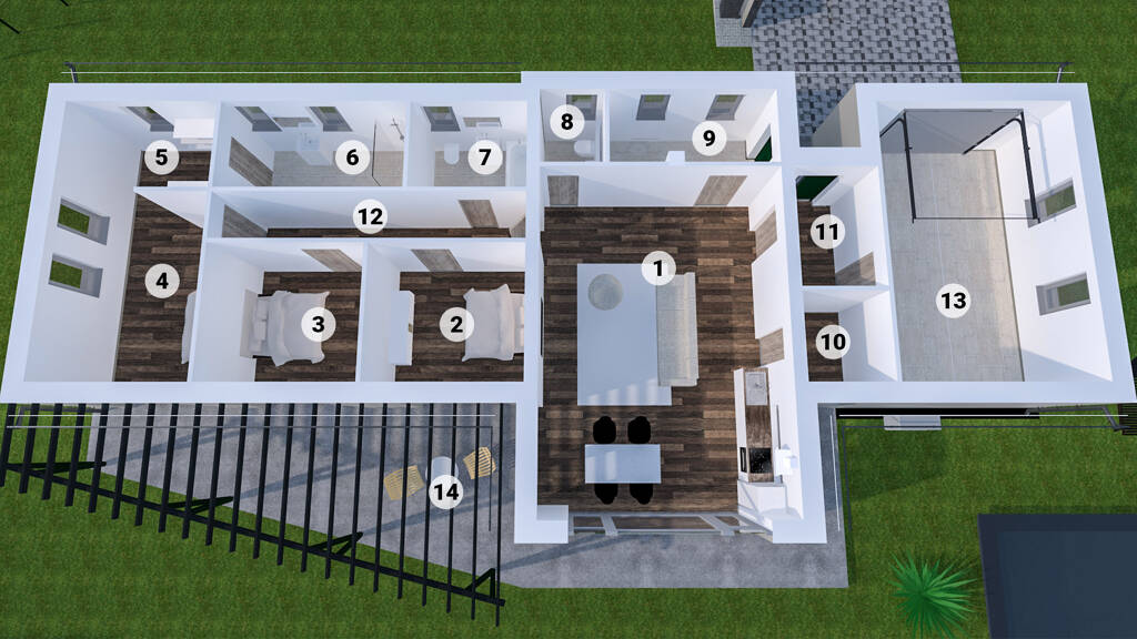 Innen gibt es eine große Küche-Wohnzimmer-Esszimmer-Kombination, 3 Zimmer, eine Garderobe, 2 Badezimmer + WC, 1 separates WC, 1 Speisekammer, Technikraum-Waschküche, Windfang, Flur, Garage und Terrasse.