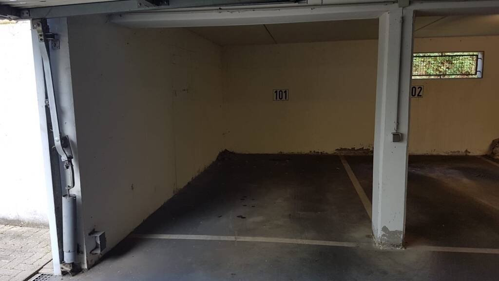 Trockene und belüftete Tiefgarage im Erdgeschoss eines modernen Mehrfamilienhaus mit ebenerdiger Zufahrt und Elektrorolltor.
