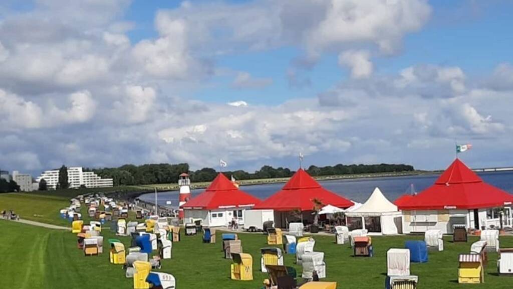 Vom Seedeich und dem grünen Strand sind die vorbeiziehenden Kreuzfahrt- und Containerschiffe, Fähren, Krabbenkutter, Yachten und Großsegler zu beobachten.