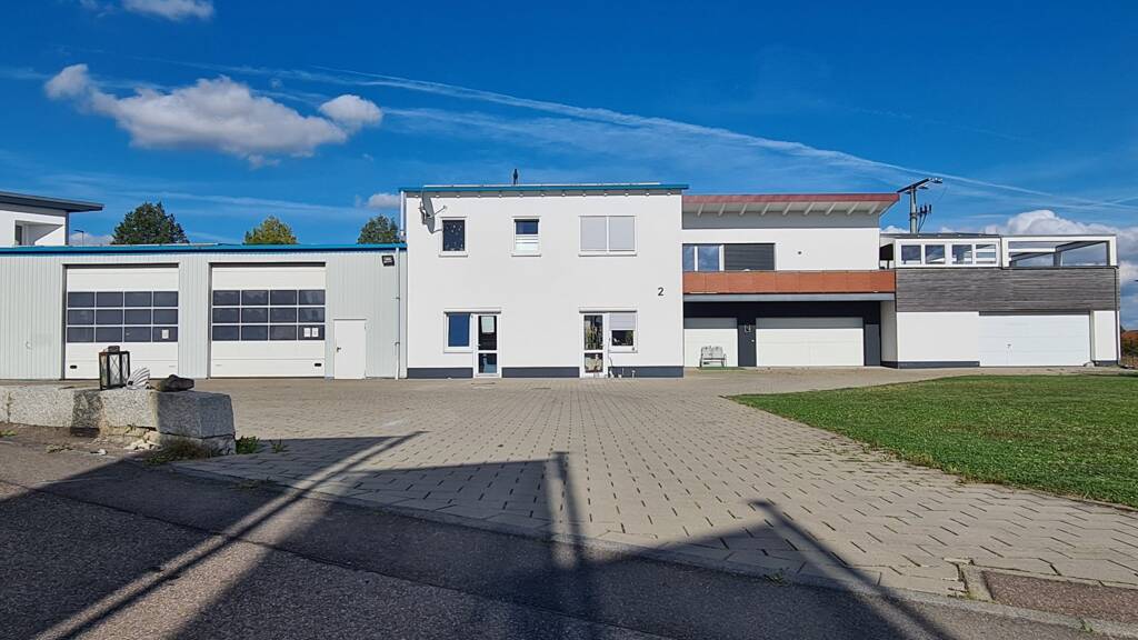 Das hier zum Ankauf näher vorgestellte Wohnhaus mit Bürotrakt, Gewerbehalle und mehreren Garagen liegt im nördlichen Gewerbegebiet in Öpfingen.