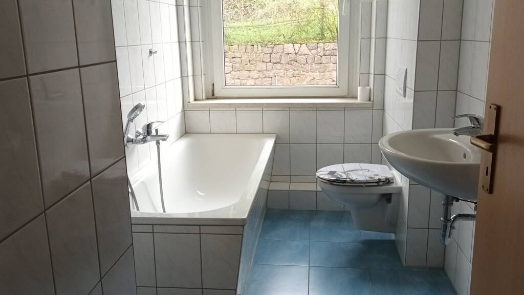 Raumaufteilung 3 Zimmer, Küche und Bad mit Fenster, Bad mit Badewanne und Waschmaschinenanschluss.
