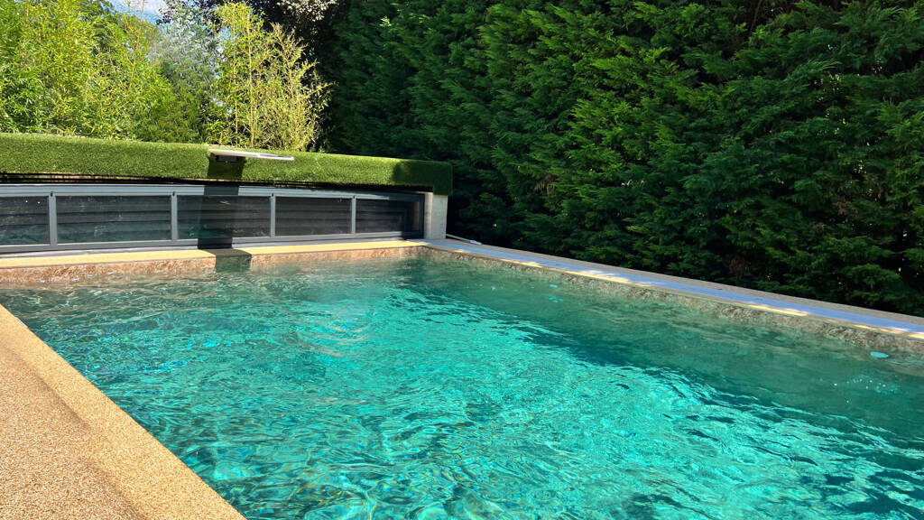 Neben der Sonnenterrasse wurde ein Außenschwimmbecken angelegt, das das Bild des Hauses einrahmt.