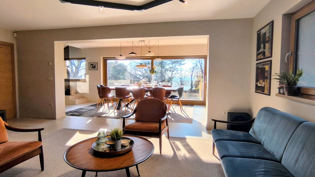 Das 3-stöckige Haus hat eine Fläche von 240 qm, das Haus wird mit einer Wärmepumpen-Fußbodenheizung beheizt, alternativ kann man an kalten Wintertagen die Wärme des Kamins genießen.