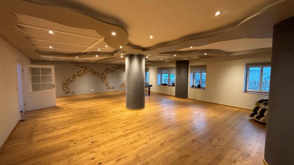 Die gesamte Wohnfläche beläuft sich auf ca. 484 m² und ist unterteilt in ein Haupthaus und eine ehemalige Gewerbefläche, welche in Wohnraum umgewandelt wurde. Oberhalb dieser befindet sich eine weitere Wohnung im Rohbau. Das Erdgeschoss unterteilt sich in zwei Schlafzimmer, zwei geräumige Wohnzimmer, zwei Küchen, Flure, Eingangsbereich, Garderobe, Tageslichtbad mit Dusche/Wanne/WC, Spind, Ankleide, Hauswirtschaftsraum, Abstellraum und zwei WCs. Über eine Holztreppe erreicht man das Obergeschoss. Dieses teilt sich auf in eine Galerie, Büro, Flur, zwei Schlafzimmer, Abstellzimmer und ein Tageslichtbad mit Dusche/WC. Das ausgebaute Dachgeschoss mit Flur und zwei Schlafzimmern ist ebenfalls über eine Holztreppe zu erreichen.