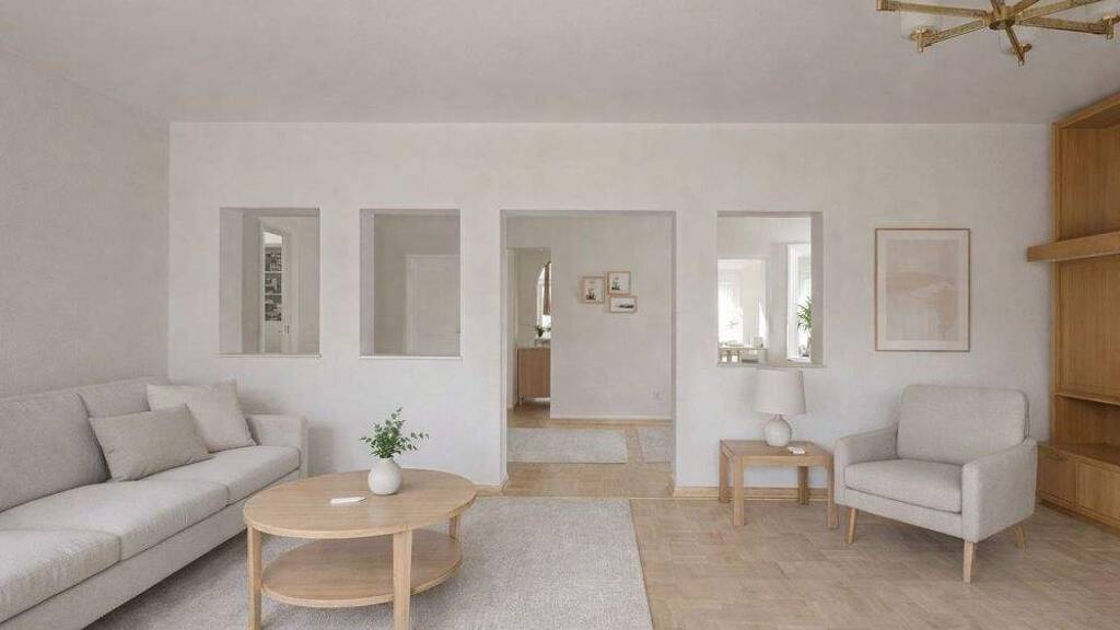 In dem Exposé sind mehrere Innenraumdarstellungen ausdrücklich als "Fotomontage" gekennzeichnet (z. B. Wohnbereich, Essbereich, Küche, Schlafräume, Bad). Diese Bilder zeigen einen Gestaltungsvorschlag, wie die Räume nach einer Modernisierung wirken können - also Inspiration, kein Ist-Zustand.