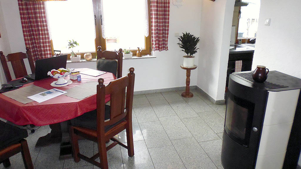 Beheizt wir das Haus über einen Feststoffofen mit Warmluftverteilung zum Wohn- und Esszimmer, zum Schlafzimmer und zum Badezimmer. Zusätzlich steht im Esszimmer ein hochwertiger Pelletofen, der das ganze Erdgeschoss beheizt, zur Verfügung.