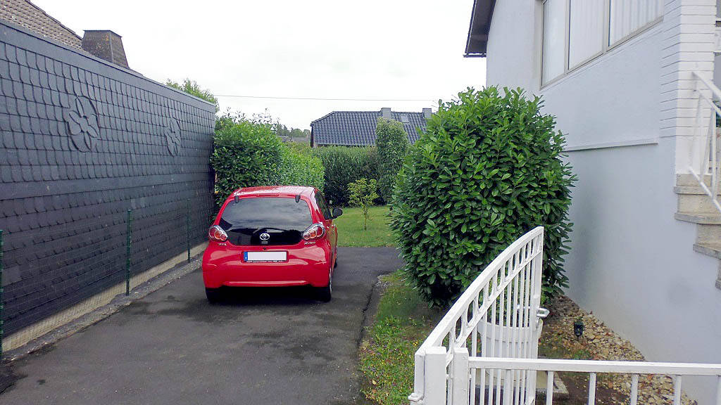Vor der im Haus integrierten Garage steht ein Kfz.-Stellplatz zur Verfügung. Die Einfahrt kann mittels vorhandenem Tor geschlossen werden.