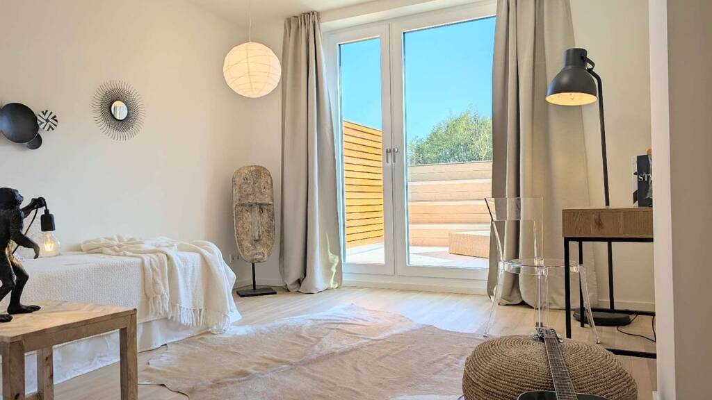 Zweischichtparkett aus naturbelassener Eiche, verlegt im Schiffsverband, bringt Wärme und Charakter in die Wohnräume. Die Außenanlagen sind nicht einfach nur angelegt, sondern wurden individuell von einer Landschaftsarchitektin entworfen - ein durchgängiges Gestaltungskonzept, das Funktion und Ästhetik vereint.